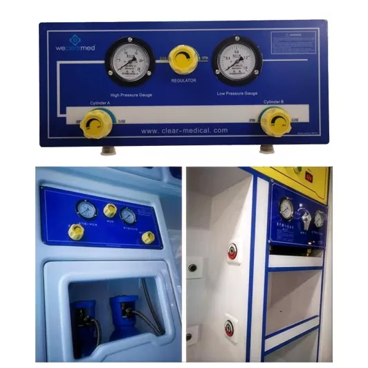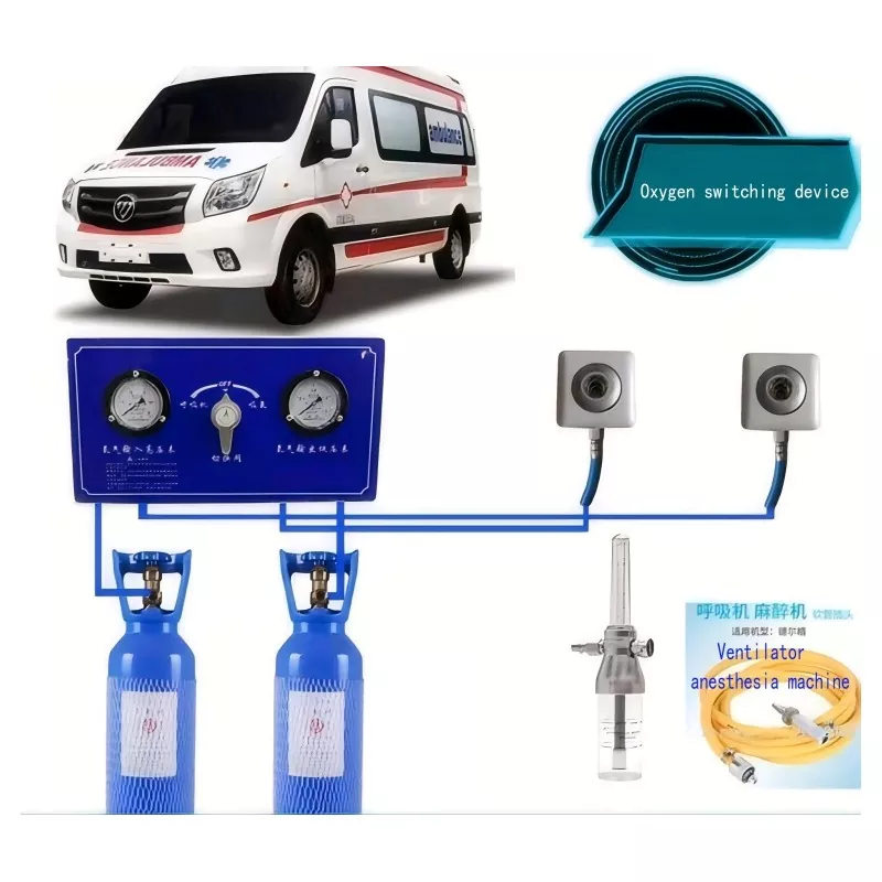 وحدة الإسعاف الطبية المنوع مناسبة لسيارات الإسعاف مع ارتفاع استهلاك الأكسجين. إنه يدخل الأكسجين المعبأ في زجاجات من خلال خرطوم المعادن إلى خط أنابيب لوحة التحكم الرئيسية ، ويتم تسليم الأكسجين عالي الضغط إلى محطة الأكسجين من خلال خط أنابيب الضغط المنخفض بعد الاكتئاب لاستخدامه كمصدر للأوكسجين لاستخدام الإسعافات الأولية. يتمثل مبدأ العمل في إلغاء ضغط الأكسجين عالي الضغط إلى ضغط منخفض وتوصيله إلى محطة الأكسجين من خلال خط الأنابيب المعني ، وذلك لتزويد منفذ محطة الأكسجين ومنفذ التهوية. يمكن توصيل لوحة التحكم باسطوانين أو أكثر من أسطوانات الأكسجين في نفس الوقت لإزالة ضغط الأكسجين عالي الضغط المعبأة في الضغط على ضغط معين ، وهو نوع من المعدات لإمداد الغاز المركزي. تتكون لوحة التحكم من خط أنابيب عالي الضغط مصنوع من خرطوم المعادن ، وهو متصل بأسطوانات الأكسجين من خلال خيوط G5/8. يتم توصيل كل أسطوانة الأكسجين بلوحة التحكم مع صمام تبديل الضغط العالي المقابل ، والذي يتحكم في خط أنابيب الضغط العالي المعني. يتم توصيل خط أنابيب الضغط العالي الذي يربط كل أسطوانة الأكسجين في الطرف الخلفي من صمام التبديل ببعضها البعض ، ويتم تزويد المنوع بموصل تي شيرات في منتصف المشعب لتوصيل مقياس الضغط العالي والمنظم وخط الأنابيب عالي الضغط في السلسلة. يتم استخدام مقياس الضغط العالي لمراقبة ضغط الأكسجين في خط أنابيب الضغط العالي في لوحة التحكم ، ويستخدم المنظم لتنظيم الأكسجين عالي الضغط إلى الضغط المطلوب ثم الإخراج إلى محطة الضغط المنخفض. يتم توصيل نهاية الضغط المنخفض بمحطة الأكسجين وصمام أمان ومقياس الضغط المنخفض ، والذي يتم استخدامه لمراقبة الضغط في خط أنابيب الضغط المنخفض في لوحة التحكم ، بينما يستنفد صمام الأمان الغاز تلقائيًا عندما يكون ضغط الإخراج أعلى من ضغط التصميم ، وذلك لضمان أمان واستقرار ضغط الخرج تلقائيًا. هذا النظام مناسب لأي مكان يلزم تبديل تقارب الغاز لرصد ضغط الغاز والكمية المتبقية للغاز ، مثل: المستشفيات ، وسيارات الإسعاف ، والبترول ، ومحطات غاز البترول المسال وغيرها من المؤسسات والمؤسسات الصناعية والتعدين.